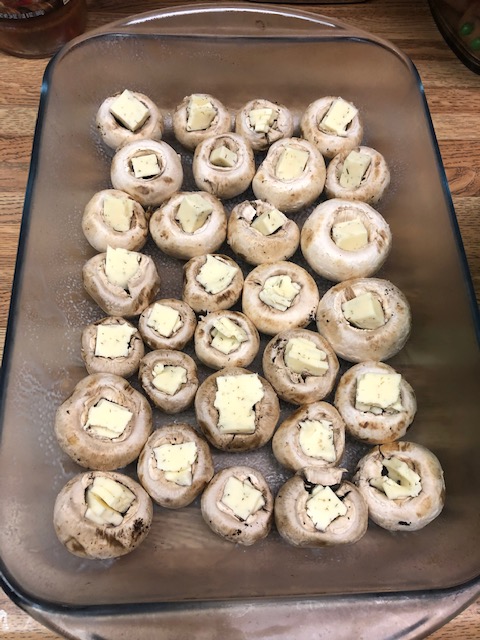 - Take the stems off of the mushrooms and place in a greased 9×13 pan.