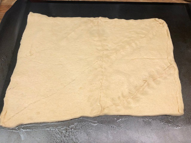 - Lay crescent rolls out on greased baking sheet. I rolled mine out a bit and creased the seams.