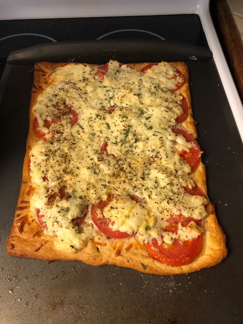 I was thinking this would be more of a snack, but ended up turning out to be part of dinner. Lessons learned: don’t forget minced garlic and place tomatoes closer to the edge… and maybe don’t cook as long. 🙂