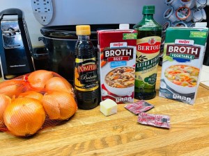 If you love French onion soup, you will love this one… or if you have not ever had French onion soup, but love onions, this is worth a try. Keep in mind – this is a recipe that calls for 20 hours of cook time. If you do end up cooking the onions for 10 hours, be prepared for a potent smell. For some it may not bother but others in the house it may, so check with them. It’s been suggested in the original recipe to put the crockpot in a screened in porch area or in another building since the smell can get a bit overwhelming.