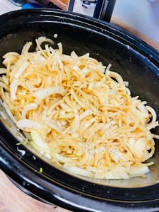 - Once all sliced, I melted the butter and poured over the onions. I did the same with the olive oil and sprinkled the beef ramen seasoning over the onions. I also sprinkled some garlic salt over the onions. Stir with a wooden spoon and put lid back on crockpot.