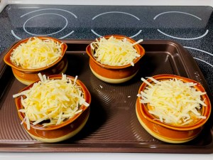 - Add the gruyere cheese that has been shredded – use your judgement – the original recipe calls for 1/3 cup per bowl.