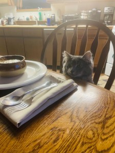 As we ate dinner, Oliver was allowed to sit at the table with us as long as he kept his paw off the table… only took us saying to keep his paw off the table around 6 times.