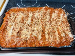 - Grease a 9×13 pan and put maybe 1 cup of sauce and spread out. That’s OK if it doesn’t fully cover the bottom.