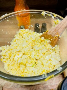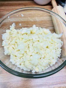 - Drain water off of cauliflower and let cool for a couple minutes. I put this in a zip lock bag and took a rolling pin to it. You can also put this in a food processor to rice the cauliflower.