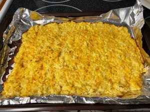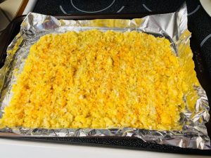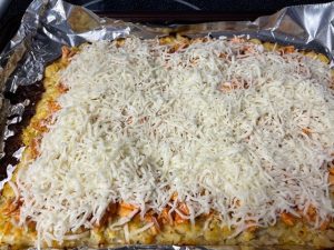 - Add cauliflower mix to the greased foil. With a spatula, make into a rectangle. I did sprinkle some parmesan cheese on top at this time, as well as more of the buffalo ranch seasoning.