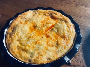 5. Place in oven and cook for 30-40 minutes. Once the center is set and the cheese is brown, this is done.