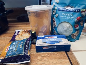 - Melt 8 oz of the white chocolate chips in the microwave – when you do this, microwave at 30 seconds at a time.