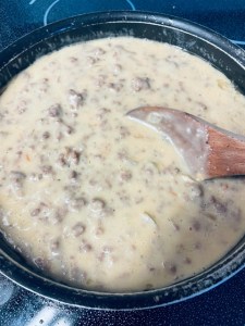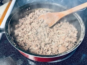 - Pour the soup mix into the skillet with the meat and continue to cook until it starts to bubble.