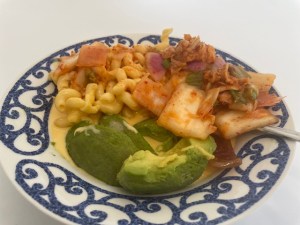 Lunch: chickpea pasta with mac & cheese sauce, 1 small avocado, a couple forkfuls of homemade kimchi