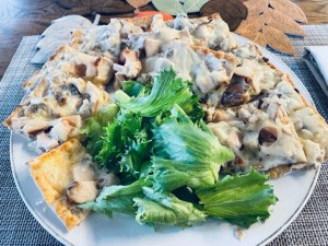 Dinner: 1 lavash flatbread with homemade alfredo mushroom sauce, 1 smoked chicken breast diced, 5 thin slices swiss cheese, lettuce