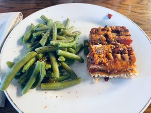 Dinner: 1/2 plate green beans with tajin seasoning, 3 small pieces of lasagna – this was made with whole wheat lasagna noodles and instead of beef and sausage that I use in the original lasagna recipe I make, I used crumbled up black bean burgers. It tasted amazing!