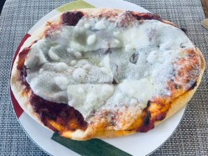 Lunch: Garlic flat bread pizza with homemade pasta sauce and smoked provolone cheese on top.