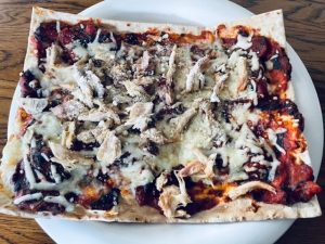 Lunch: Lavash flatbread pizza with smoked chicken and parmesan cheese on top.