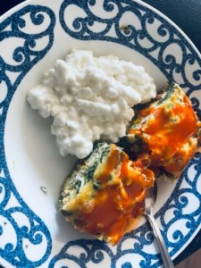 Breakfast: Egg & Vegetable casserole with buffalo sauce drizzled on top and cottage cheese