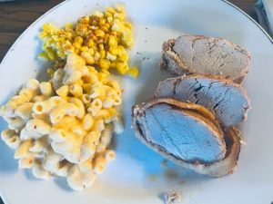 Dinner: Pork tenderloin with chickpea mac and cheese (homemade) and corn with tajin seasoning.