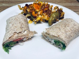 Dinner: Whole grain/flax seed wrap with buffalo chicken breast, lettuce, tomatoes, onion, feta cheese and chickpea Banza pasta with sloppy joe refried bean mix, pickles and banana peppers – buffalo sauce drizzled on top and homemade horseradish sauce for dipping the wrap.