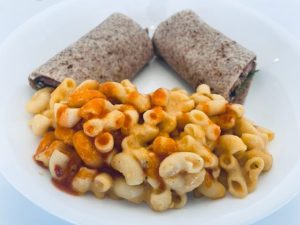 Lunch: Whole grain/flax seed wrap with lettuce, tomatoes, bacon and light mayo, chickpea mac & cheese pasta I made from the other night with greek yogurt.