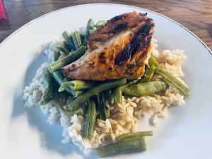 Dinner: Brown rice, green beans with tajin seasoning, 1/2 chicken breast.