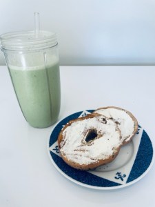 Breakfast: 1 Dave’s Killer Bread Everything Epic bagel with low-fat cream cheese and a smoothie with spinach, an apple, a banana, ice, and almond milk.