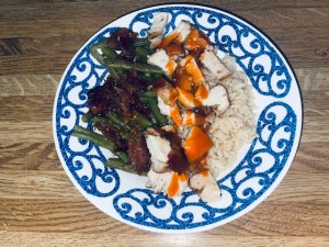 Dinner: Brown rice, green beans with bacon and tajin seasoning, half a chicken breast with buffalo sauce drizzled on top.