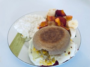 Breakfast: 1 egg with onions and mustard on a Dave’s Killer Bread English Muffin, cottage cheese. I also had 1 banana and 1 peach.