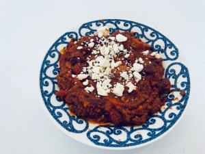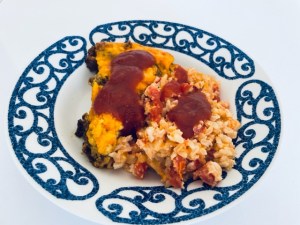 Lunch: 1 piece taco pie with brown rice with eggs & cheese and homemade taco sauce on top.