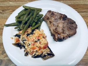 Dinner: Pork steak (from a local butcher), green beans and brown rice with rotel, cheese and mushrooms.