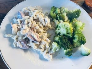 Dinner: Chicken, Kielbasa, Shrimp Alfredo Pasta with broccoli – recipe here!