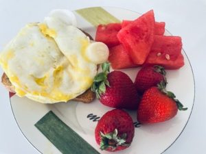 Breakfast: 1 egg with onions and mustard on multi-grain bread with kiwi and strawberries.