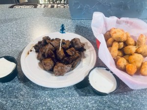 Lunch: We went to the Buckhorn since we have not been there in a while. Steak bites with homemade horseradish sauce, 1/2 of the order of cheese curds with ranch.