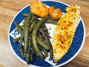 Dinner: 1 tilapia filet with olive oil and lemon pepper seasoning, green beans with mushrooms and tajin seasoning, rest of cheese curds and ranch dressing from lunch. Not all cheese curds are pictured!