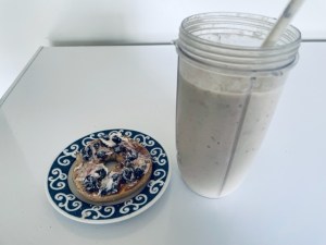 Breakfast: One-half of Dave’s Killer Bread Epic Everything Bagel with low fat cream cheese and blueberries on top; smoothie with almond milk, regular whole milk, 1 banana, 1 apple, 1 peach, Greek yogurt.
