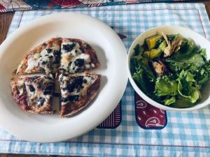 Lunch: 1 whole wheat pita bread with homemade pasta sauce, cheese, and mushrooms with a salad that has a small avocado, onions, smoked pulled pork from last night, and a very small amount of ranch dressing.