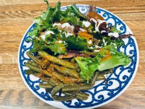 Dinner: Green beans with mushrooms and tajin seasoning, salad with leftover smoked pork butt from last night, Cairo BBQ sauce and a little ranch on top.