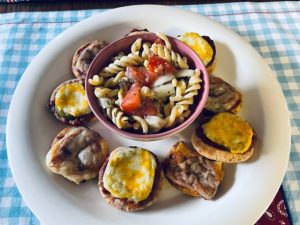 Lunch: Mini pita bites with homemade pasta sauce – some had pickles and cheese, others just had cheese, then a cup of the cold pasta I had made the other day.