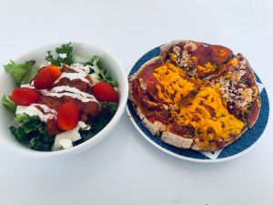 Lunch: Wheat pita with homemade pasta sauce, ground chicken, onions, 3 big pepperoni slices, cheddar cheese (shredded from a block); salad with feta cheese, cherry tomatoes, onions, salsa and a drizzle of ranch dressing.
