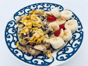 Breakfast: Two eggs with mushrooms and mustard drizzled on top; 1 banana and 1 little strawberry.