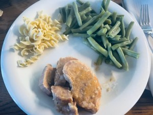 Dinner: Smothered crockpot pork chops, green beans, butter noodles with parsley.