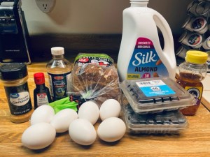- Add the eggs, almond milk, honey, extracts, and cinnamon all in a large bowl and whisk together.