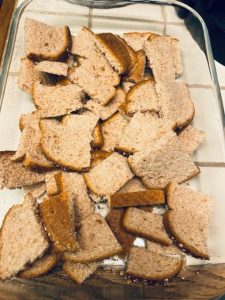 - Cube the bread up and place in a 9×13 greased baking dish.