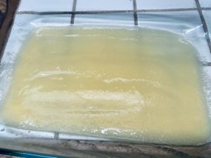 - Spread butter sugar mixture in the bottom of the 9×13 baking dish and spread evenly.