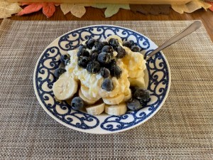 Breakfast: 2 bananas, cottage cheese, frozen blueberries and honey drizzled on top.