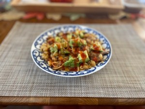 Lunch: Leftover beef rib from last week, cutup venison from the other night, Banza Chickpea Mac & Cheese, 1 small avocado, tomatoes, mushrooms with tajin seasoning and buffalo sauce drizzled on top.