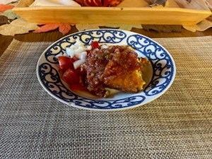 Dinner: Crustless taco pie with tomatoes, onions, homemade salsa and homemade taco sauce.