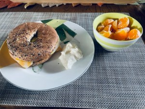 Breakfast: Dave’s Killer Bread Everything Epic bagel with an egg, cheese, and mayo/horseradish. Two clementine oranges as well.