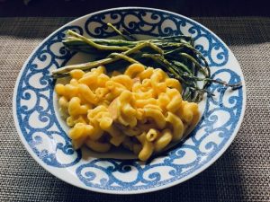 Dinner: Macaroni and cheese with kielbasa, and asparagus.
