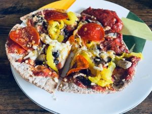 Lunch: Whole wheat pita bread with homemade pasta sauce, banana peppers, mushrooms, pepperoni and cheese.
