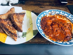 Lunch: Chili with two grilled cheese – with the Dave’s Killer Bread and thin sargento slices of cheese.