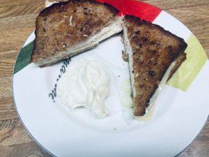 Breakfast: Coffee with creamer, Dave’s Killer Good Seed Bread with thin slices of swiss cheese and chicken, mayo/horseradish.